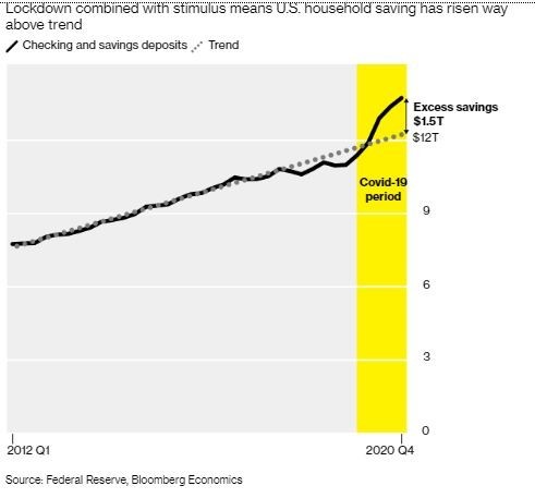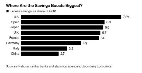 Όσον αφορά στις ΗΠΑ, τα χρήματα που εξοικονομήθηκαν τον περασμένο ένα χρόνο θα οδηγούσαν την οικονομία σε ανάκαμψη της τάξεως του 9% και όχι του 4,6% σύμφωνα με τις μέχρι τώρα προβλέψεις για το ΑΕΠ του 2021. Αντίθετα, όμως, εάν οι αποταμιεύσεις δεν δαπανηθούν, η οικονομία θα σημειώσει ανάπτυξη πιθανώς μόλις 2,2%.