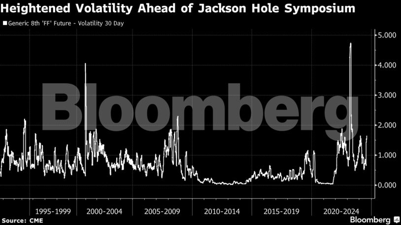 Τα συμβόλαια μελλοντικής εκπλήρωσης των ομοσπονδιακών κεφαλαίων παρουσιάζουν μεγάλες διακυμάνσεις φέτος. Η πραγματοποιηθείσα μεταβλητότητα 30 ημερών για τα συμβόλαια αυτά εκτινάχθηκε στο 1,86 την περασμένη εβδομάδα, το υψηλότερο επίπεδο από τον Ιούνιο του 2023, όταν αυξήθηκε στον απόηχο της τραπεζικής κρίσης στις ΗΠΑ.