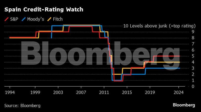 Οι αναλυτές της Moody’s Olivier Chemla και Dietmar Hornung διατήρησαν την Ισπανία στο Baa1, την τρίτη χαμηλότερη επενδυτική βαθμίδα. Μια ξεχωριστή αναθεώρηση αξιολόγησης από την S&P Global Ratings διατήρησε τη χώρα στο Α, δύο βαθμίδες υψηλότερα.