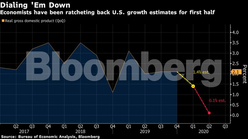 Οι προβλέψεις για τις ΗΠΑ εξακολουθούν να ποικίλλουν αρκετά, ενώ κάποιοι εικάζουν ότι η δραστηριότητα θα μπορούσε να μειωθεί έως και 10% σε ετήσια βάση κατά τους τρεις μήνες έως τον Ιούνιο. Η Goldman Sachs εκτιμά ότι θα υπάρξει μείωση κατά 5% στην ανάπτυξη μετά από μηδενική ανάπτυξη το πρώτο τρίμηνο.
