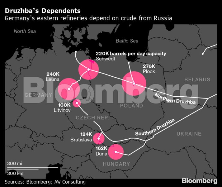 Η Ρωσία προμηθεύει περίπου 250.000 βαρέλια την ημέρα μέσω του νότιου σκέλους του αγωγού Ντρούζμπα στην Ουγγαρία, τη Σλοβακία και την Τσεχική Δημοκρατία. Οι ουγγρικές MOL και Unipetrol, που ελέγχονται από την PKN Orlen, είναι οι κύριοι αγοραστές πετρελαίου μέσω της συγκεκριμένης διαδρομής, ενώ οι ρωσικές Lukoil, Rosneft και Tatneft είναι οι κύριοι προμηθευτές πετρελαίου.