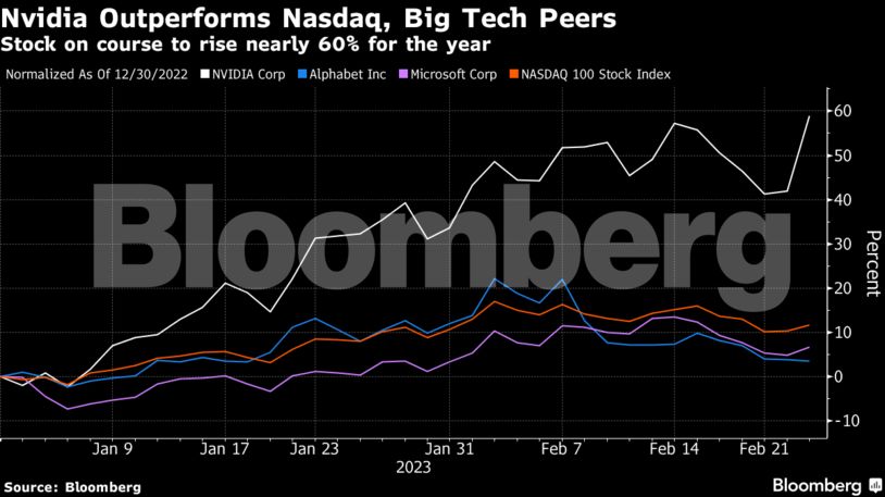 Η Nvidia κατέχει την πρώτη θέση της αγοράς των καρτών γραφικών οι οποίες χρησιμοποιούνται για τους πολύπλοκους υπολογισμούς οι οποίοι «τροφοδοτούν» το ΑΙ. Αυτό, με τη σειρά του, υποδεικνύει σε πολλούς αναλυτές και επενδυτές πως η εταιρεία θα βγει κερδισμένη από την επέκταση των εφαρμογών τύπου ChatGPT.
