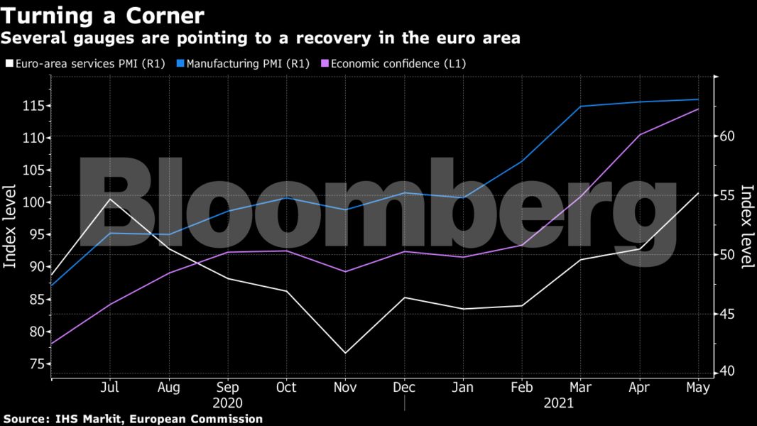 Στο φόντο των αποφάσεων βρίσκεται μία ευρωπαϊκή οικονομία σε τροχιά ανάκαμψης λόγω των υψηλότερων ποσοστών εμβολιασμού και της μείωσης των νέων κρουσμάτων. Ως εκ τούτου, υπηρεσίες εστίασης, λιανεμπόριο και άλλοι κλάδοι παρουσιάζουν σημάδια ανάκαμψης. Αυτό όμως οδηγεί και σε άνοδο των τιμών, εγείροντας ερωτήματα για το πότε είναι η κατάλληλη στιγμή για την ΕΚΤ προκειμένου να αναλάβει δράση για τη διατήρηση του ελέγχου του πληθωρισμού.