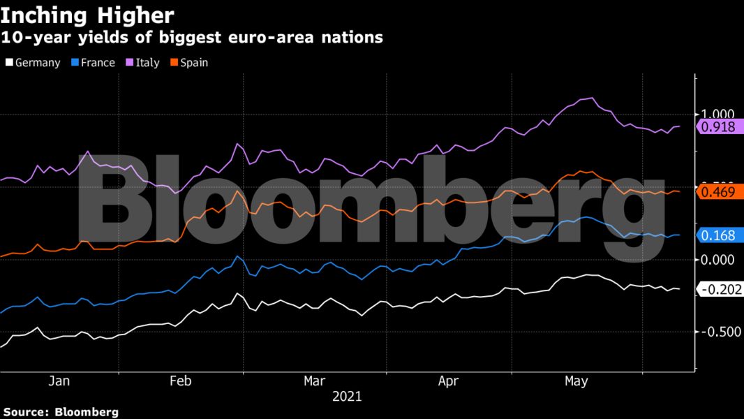 Παρά την περαιτέρω αγορά ομολόγων, οι αποδόσεις έχουν αυξηθεί από τον Μάρτιο. Αυτό οφείλεται εν μέρει στις προσδοκίες ότι η επιτάχυνση του πληθωρισμού παγκοσμίως θα αναγκάσει τις κεντρικές τράπεζες να περιορίσουν τη νομισματική πολιτική. Τα πρόσφατα σχόλια αξιωματούχων της ΕΚΤ έχουν αμβλύνει ορισμένους από αυτούς τους φόβους, αν και το spread μεταξύ γερμανικού και ιταλικού δεκαετούς χρέους παραμένει μεγαλύτερο από ό, τι πριν από ένα μήνα.