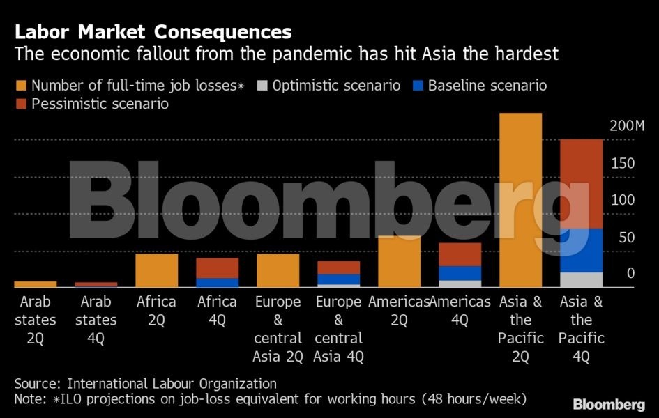 Το πλήγμα στην αγορά εργασίας είναι χειρότερο από ό, τι είχε αρχικά εκτιμηθεί και θα είναι αδύνατο να αναστραφεί το δεύτερο εξάμηνο του 2020, ακόμη και στο πιο αισιόδοξο σενάριο, σύμφωνα με τη Διεθνή Οργάνωση Εργασίας (ILO). Την περασμένη εβδομάδα η Οργάνωση εκτίμησε ότι οι ώρες εργασίας στο δεύτερο τρίμηνο ήταν κατά 14% μειωμένες από ό, τι πριν από τον ιό, κάτι που ισοδυναμεί με απώλεια 400 εκατομμυρίων θέσεων πλήρους απασχόλησης.