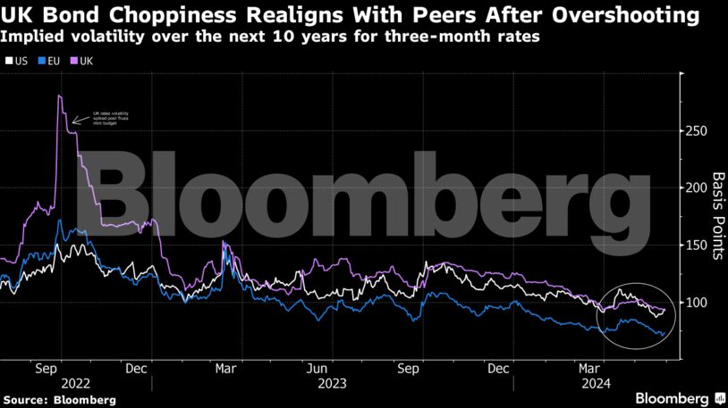 Η μεταβλητότητα των βρετανικών ομολόγων επαναπροσαρμόζεται σε σχέση με τις κύριες ομοειδείς αγορές ενόψει των εκλογών, μετά τη συνεχή υπερκάλυψη των διακυμάνσεων στις αγορές επιτοκίων των ΗΠΑ και της Ευρώπης, δεδομένης της κρίσης του μίνι προϋπολογισμού της πρώην πρωθυπουργού Λιζ Τρας στα τέλη του 2022.