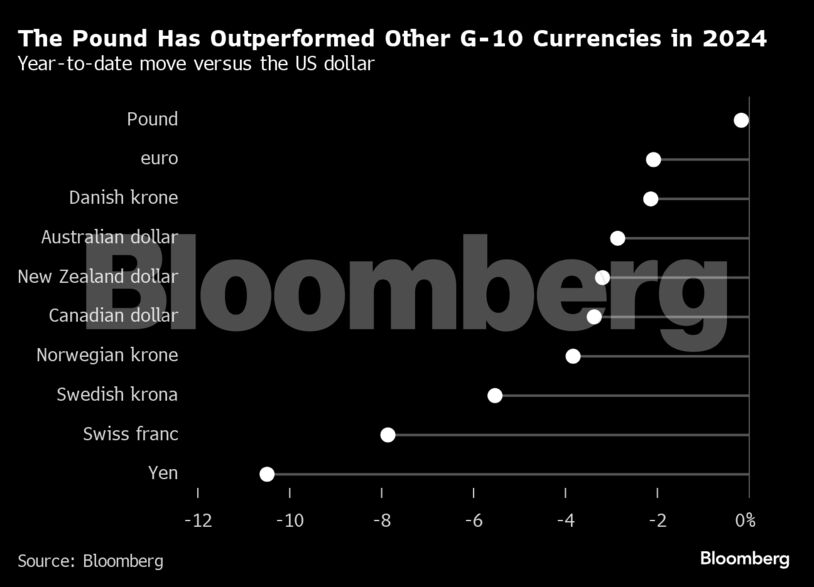 Η στερλίνα διατηρεί την καλύτερη θέση μεταξύ των νομισμάτων του γκρουπ των G10 έναντι του δολαρίου φέτος, λόγω των αυξανόμενων προσδοκιών ότι η Τράπεζα της Αγγλίας θα καθυστερήσει σε σχέση με άλλες χώρες όσον αφορά τη μείωση των επιτοκίων. Η ανακοίνωση των εκλογών την περασμένη εβδομάδα κλόνισε ελάχιστα αυτό το αφήγημα.