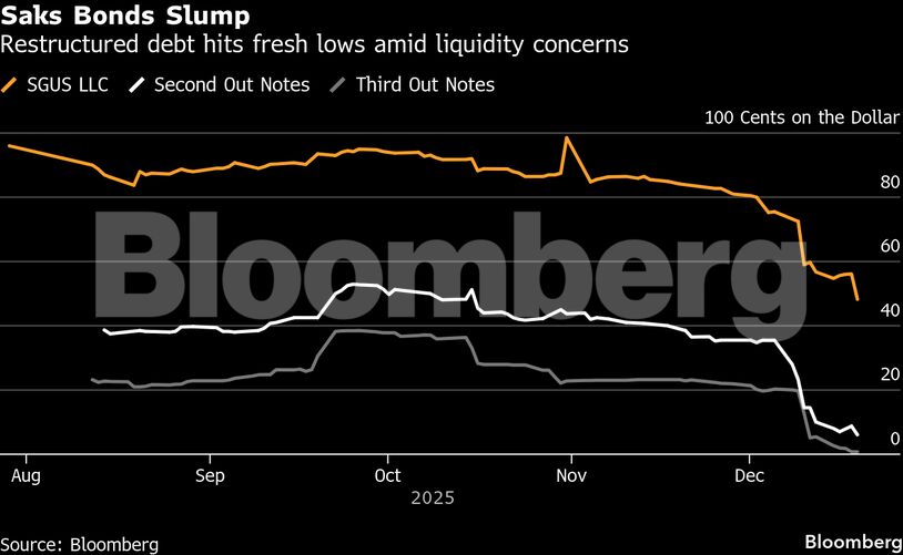 Η Saks βρίσκεται αντιμέτωπη με πληρωμές τόκων άνω των 100 εκατ. δολαρίων, οι οποίες λήγουν στις 30 Δεκεμβρίου, σύμφωνα με στοιχεία που συγκέντρωσε το Bloomberg. Το τμήμα ύψους 941 εκατ. δολαρίων των ομολογιών δεύτερης διαβάθμισης της Saks, που αναδιαρθρώθηκαν τον Αύγουστο, διαπραγματευόταν τη Δευτέρα περίπου στα 7,5 σεντς ανά δολάριο, από περίπου 36 σεντς μόλις δύο εβδομάδες νωρίτερα, σύμφωνα με τιμολόγηση της Trace. Περίπου 762 εκατ. δολάρια πιο ανώτερου χρέους αποτιμώνταν κοντά στα 48 σεντς ανά δολάριο.