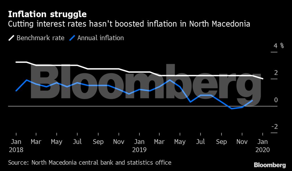 Αυτή η έλξη έχει επίσης κρατήσει χαμηλά και τον πληθωρισμό, ο οποίος υποχώρησε κάτω από το μηδέν πέρυσι. Η Βόρεια Μακεδονία προσπαθεί τώρα να διερευνήσει πόσο χαμηλότερα στην πορεία προς το μηδέν μπορεί να φτάσει το επιτόκιο αναφοράς της, δήλωσε η διοικητής της κεντρικής τράπεζας Ανίτα Ανγκελόβσκα- Μπεζόσκα.