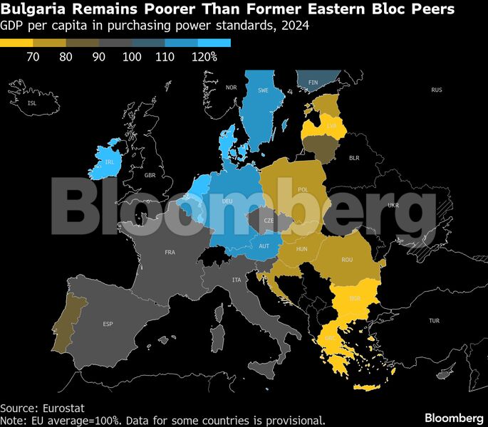 Ωστόσο, η σύγκλιση με τους ευρωπαϊκούς μέσους όρους παραμένει αργή. Το κατά κεφαλήν εισόδημα είναι το χαμηλότερο στην ΕΕ — περίπου στο 66% του μέσου όρου, έναντι 77% στη γειτονική Ρουμανία. Ταυτόχρονα, η Βουλγαρία καταγράφει τη μεγαλύτερη ανισότητα εισοδήματος στην Ένωση, με ελάχιστη βελτίωση από το 2007. Στη Σόφια οι μισθοί είναι διπλάσιοι σε σχέση με τη βορειοανατολική περιοχή της χώρας, την πιο φτωχή περιφέρεια της ΕΕ.