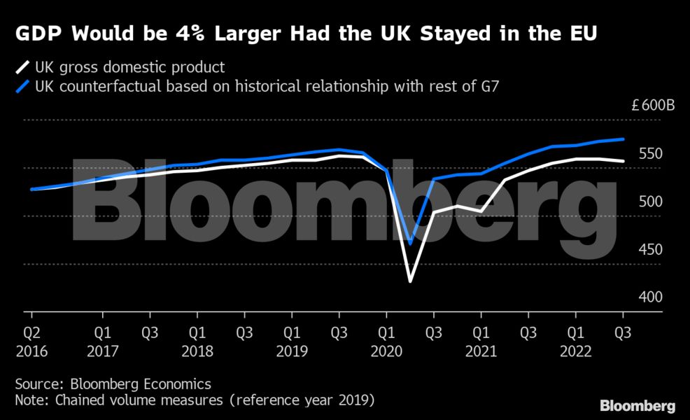 Οικονομολόγοι της Bloomberg Economics υπολογίζουν ότι το διαζύγιο από την ΕΕ, που φέρει τη σφραγίδα του Συντηρητικού Κόμματος της χώρας, έχει συρρικνώνει την οικονομία κατά 4% απ’ ό,τι θα μπορούσε να ήταν με τις επιχειρηματικές επενδύσεις να υστερούν σημαντικά και την έλλειψη εργαζομένων από χώρες της ΕΕ να αυξάνεται.