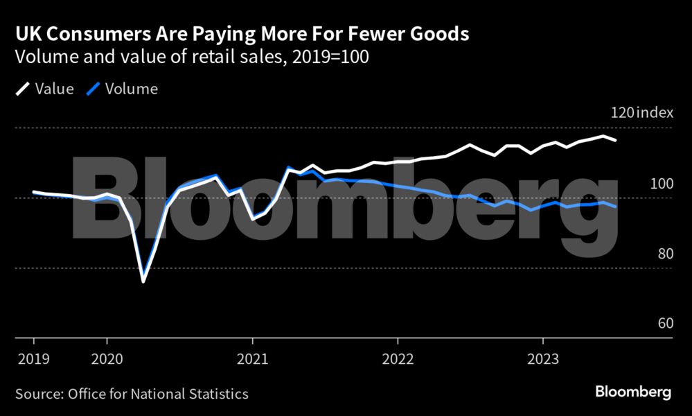 Ενώ ο όγκος των πωλήσεων έχει μειωθεί, η αξία των αγαθών έχει εκτοξευθεί από την έναρξη της κρίσης ακρίβειας το 2021, με τους καταναλωτές να ξοδεύουν περισσότερα για να αγοράσουν λιγότερα.