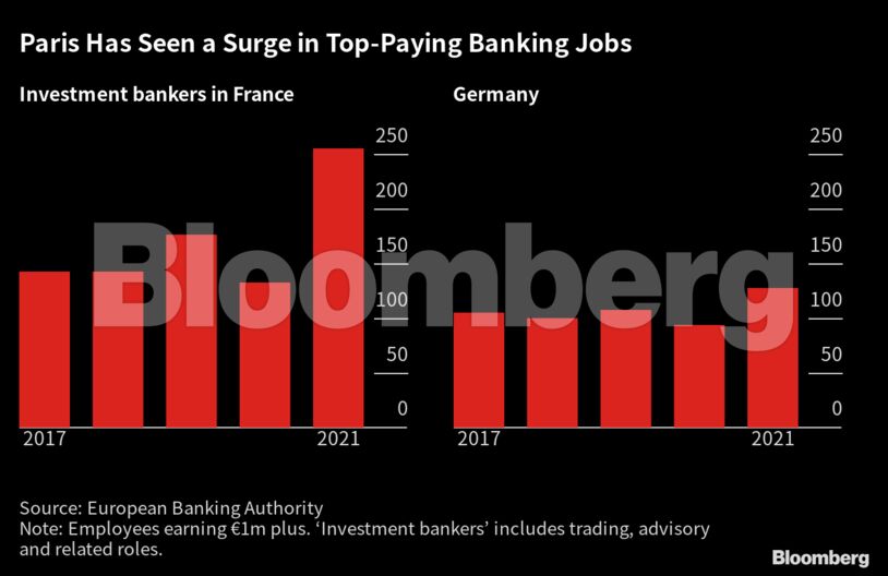 Σύμφωνα με στοιχεία της European Banking Authority, ο αριθμός των τραπεζιτών και των traders στη Γαλλία με αποδοχές άνω του 1 εκατομμυρίου ευρώ αυξήθηκε κατά 80% από το 2017. Παράλληλα, αν και το πρώτο κύμα της εξόδου από το Λονδίνου έχει τελειώσει, πολλά στελέχη των τραπεζών τόνισαν στο Bloomberg πως οι προσλήψεις στο Παρίσι θα συνεχιστούν.