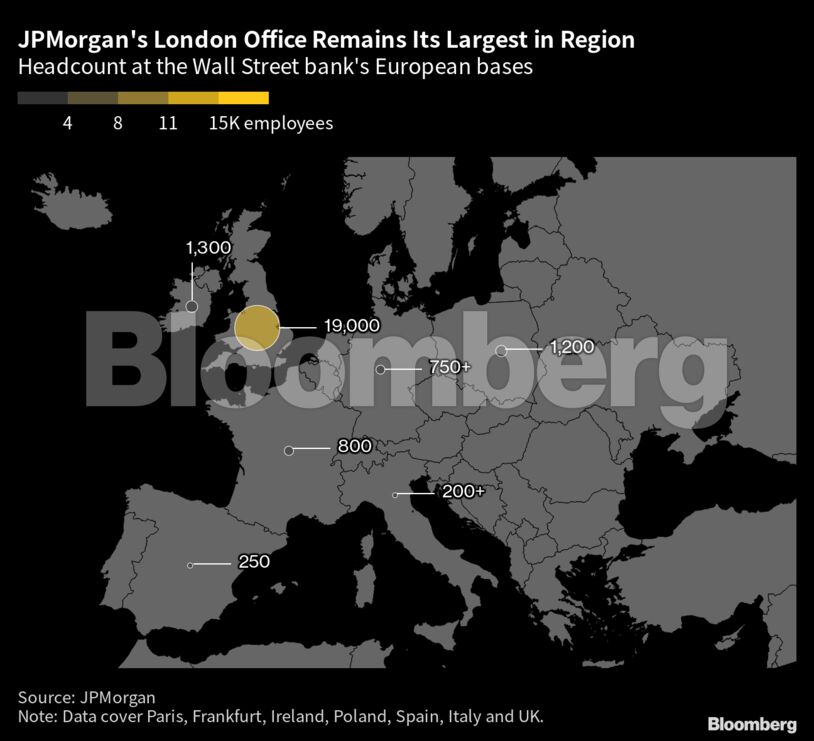 Τα γραφεία της JPMorgan Chase & Co. στο Παρίσι απασχολούν περίπου 550 άτομα, 22 φορές παραπάνω από τον αντίστοιχο αριθμό του 2019. Η BofA, από την πλευρά της, απασχολεί 600 άτομα, έχοντας εξαπλασιάσει τον αριθμό των εργαζομένων της από το 2016 μετά το δημοψήφισμα του Brexit.