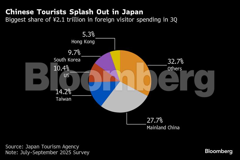 Η προειδοποίηση της Κίνας απειλεί την ανοδική δυναμική του ιαπωνικού τουρισμού — ένα από τα λίγα φωτεινά σημεία σε μια οικονομία που συρρικνώνεται. Οι Κινέζοι τουρίστες ήταν οι καλύτεροι «πελάτες» το προηγούμενο τρίμηνο, καλύπτοντας περίπου το 27% από τα 2,1 τρισ. γιεν (13,6 δισ. δολάρια) συνολικής εισερχόμενης κατανάλωσης, σύμφωνα με τον Οργανισμό Τουρισμού της Ιαπωνίας.