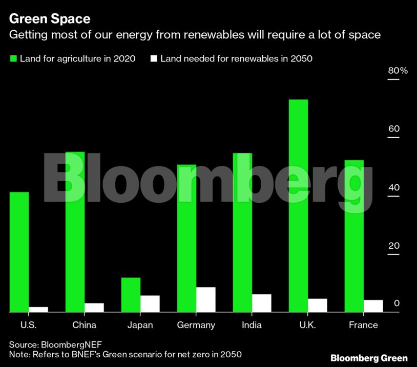 Άλλο ένα εμπόδιο είναι ο χώρος. Οι μονάδες άντλησης και παραγωγής υδρογονανθράκων είναι σχετικά μικρές σε σχέση με τα στρέμματα γης ή θάλασσας που χρειάζονται οι φάρμες αιολικής και ηλιακής ενέργειας. Σύμφωνα με ανάλυση του BloombergNEF, η επίτευξη του net zero στις δύο μεγαλύτερες οικονομίες του κόσμου θα χρειαστεί το 3% της γης της Κίνας και το 2% των ΗΠΑ.