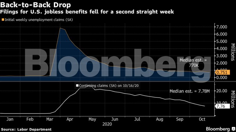 Οι αιτήσεις για το ταμείο ανεργίας – το σύνολο των Αμερικανών για τα τρέχοντα κρατικά επιδόματα ανεργίας – περιορίστηκαν σε 709.000 από 7,76 εκατ. την εβδομάδα που έληξε στις 17 Οκτωβρίου. Ωστόσο, ο αριθμός των Αμερικανών σε προγράμματα έκτακτης βοήθειας αυξήθηκε καθώς πολλοί άνεργοι εξάντλησαν τα τακτικά κρατικά επιδόματα λόγω κορωνοϊού.