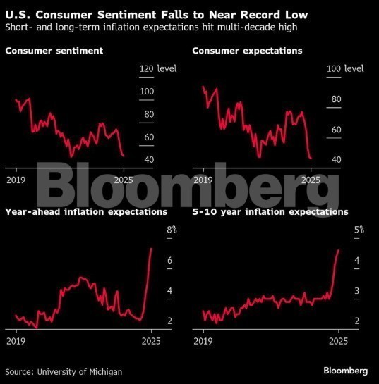 Η καταναλωτική εμπιστοσύνη στις Ηνωμένες Πολιτείες υποχώρησε απροσδόκητα σε ένα από τα χαμηλότερα επίπεδα όλων των εποχών, ενώ οι προσδοκίες για τον πληθωρισμό εκτινάχθηκαν σε υψηλά πολλών δεκαετιών, εν μέσω αυξανόμενων ανησυχιών για τους δασμούς.