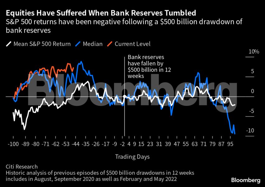 Η Citigroup μοντελοποίησε ιστορικά επεισόδια όπου τα τραπεζικά αποθέματα μειώθηκαν κατά 500 δισεκατομμύρια δολάρια σε διάστημα 12 εβδομάδων για να προσεγγίσει το τι θα συμβεί τους επόμενους μήνες.
