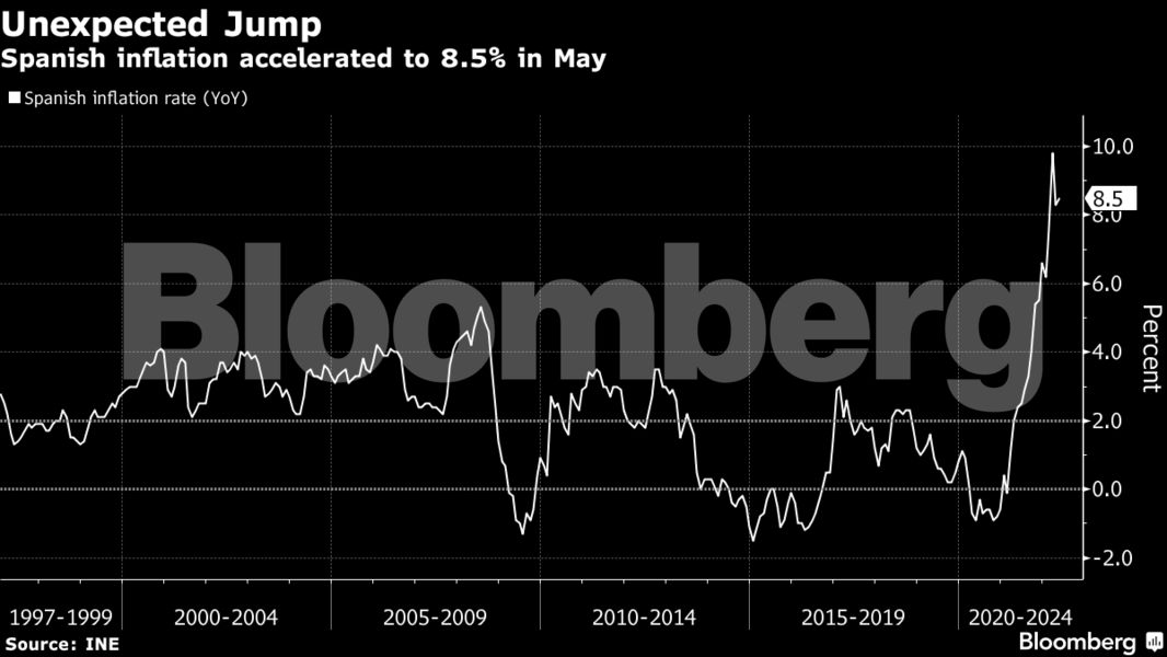 Aπροσδόκητη επιτάχυνση σημείωσε ο πληθωρισμός στην Ισπανία, συγκρατώντας τις ελπίδες ότι η άνοδος των τιμών ρεκόρ της ευρωζώνης κορυφώνεται, ενώ παράλληλα, αυξάνεται η πίεση στην Ευρωπαϊκή Κεντρική Τράπεζα να δράσει.