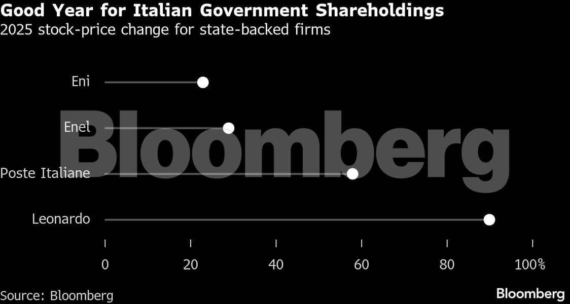 Το ιταλικό Δημόσιο είναι ο μεγαλύτερος μέτοχος της Eni, της Leonardo και της Enel, ενώ κατέχει την πλειοψηφία στην Poste Italiane. Και οι τέσσερις εταιρείες κατέγραψαν χρηματιστηριακά κέρδη το 2025, με τη Leonardo να σχεδόν διπλασιάζει την αποτίμησή της.