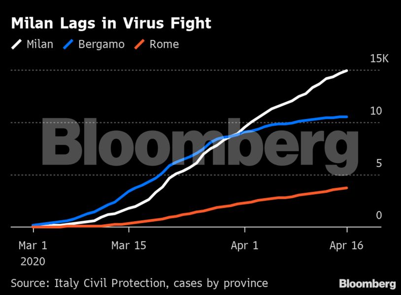 Το 30ήμερο που ολοκληρώθηκε στις 16 Απριλίου, ο ρυθμός αύξησης νέων κρουσμάτων στο Μιλάνο ήταν 30% υψηλότερο από το εθνικό επίπεδο, ενώ οι συνολικοί θάνατοι στη μητροπολιτική περιοχή σχεδόν διπλασιάστηκαν τον Μάρτιο, εν συγκρίσει με έναν χρόνο πριν. Νωρίτερα μέσα στον μήνα, η πόλη αναγκάστηκε να σταματήσει τις τελετές αποτέφρωσης για τους μη μόνιμους κατοίκους.