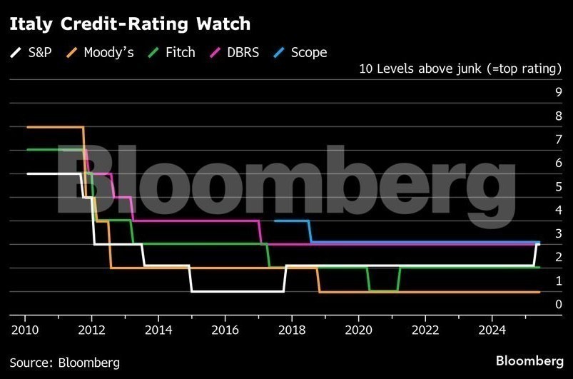 • Απρίλιος 2025: Η S&P αναβαθμίζει την Ιταλία κατά μία βαθμίδα, σε BBB+
