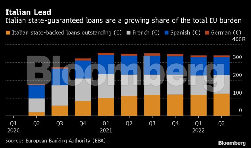 Oι ιταλικές επιχειρήσεις καλούνται να αποπληρώσουν ακόμα €123.2 δισ. σε δάνεια με κρατική εγγύηση τα οποία εκδόθηκαν κατά τη διάρκεια της πανδημίας, βάσει των στοιχείων του β’ τριμήνου του έτους, σε σχέση με €118 δισ. του α’ τριμήνου, σύμφωνα με την Ευρωπαϊκή Αρχή Τραπεζών (ΕΑΤ). Η Ιταλία, σύμφωνα με τα στοιχεία αυτά, έχει την αρνητική ευρωπαϊκή πρωτιά σε ό,τι αφορά τα εκκρεμή δάνεια τέτοιου είδους, αν και η οικονομία της χώρας προφανώς δεν είναι η μεγαλύτερη της Ευρωπαϊκής Ένωσης.