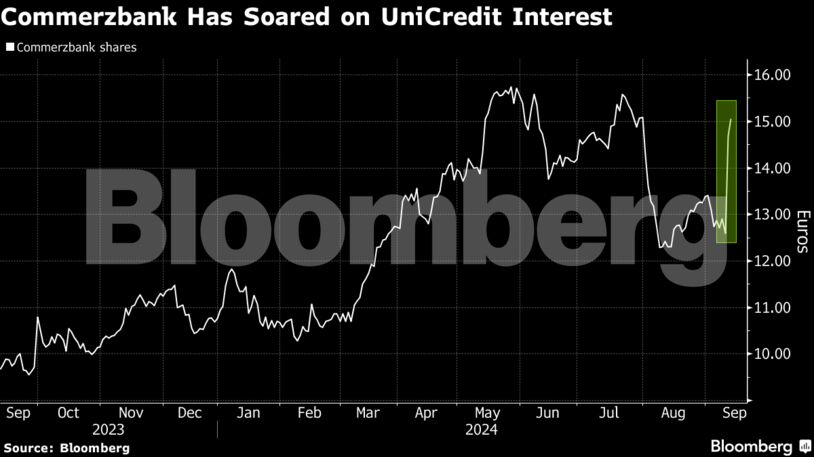 Οι μετοχές της Commerzbank σημείωσαν άνοδο 17% την Τετάρτη, αφού η UniCredit ανακοίνωσε ότι έχει χτίσει μερίδιο 9% στην εταιρεία και ότι σχεδιάζει να ξεκινήσει συνομιλίες. Το εκτελεστικό συμβούλιο της γερμανικής τράπεζας επανεξετάζει την αμυντική της στρατηγική, ανέφερε το Bloomberg News επικαλούμενο άτομα που γνωρίζουν το θέμα. Μια συγχώνευση των δύο τραπεζών θα δημιουργούσε τον μεγαλύτερο δανειστή στη Γερμανία, ξεπερνώντας την Deutsche Bank AG.