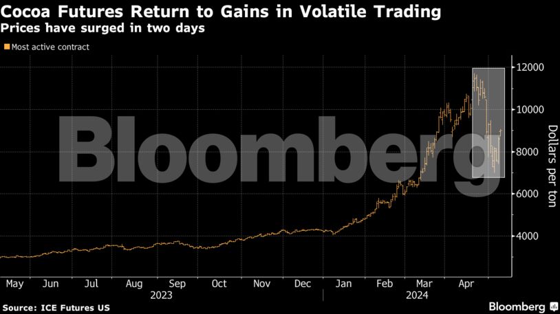 Τα συμβόλαια μελλοντικής εκπλήρωσης αυξήθηκαν έως και 5,4% την Τετάρτη 8/5 και βρίσκονται σε πορεία διήμερης ανόδου άνω του 19%, αντιστρέφοντας την τεράστια πτώση της περασμένης εβδομάδας από το πρόσφατο υψηλό ρεκόρ. Ράλι στις τιμές αφού η άνοδος του κακάο φέτος αύξησε τις απαιτήσεις περιθωρίου κέρδους, γεγονός που ώθησε τους εμπόρους να εγκαταλείψουν τις θέσεις τους και αποστράγγισε τη ρευστότητα.