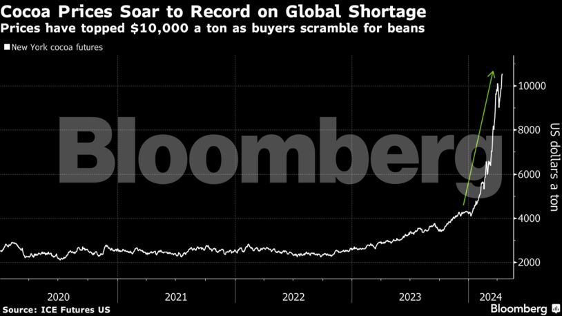 Οι τιμές έχουν εκτοξευθεί σε επίπεδα ρεκόρ, καθώς οι απογοητευτικές αφρικανικές σοδειές προκαλούν σημαντικές ελλείψεις παγκοσμίως. Αυτό αυξάνει το κόστος της σοκολάτας και αγχώνει τους επενδυτές και τα στελέχη των εταιρειών, οι οποίοι προσπαθούν να εξασφαλίσουν κόκκους, αλλά φοβούνται μήπως πληγούν από την ασταθή αγορά.