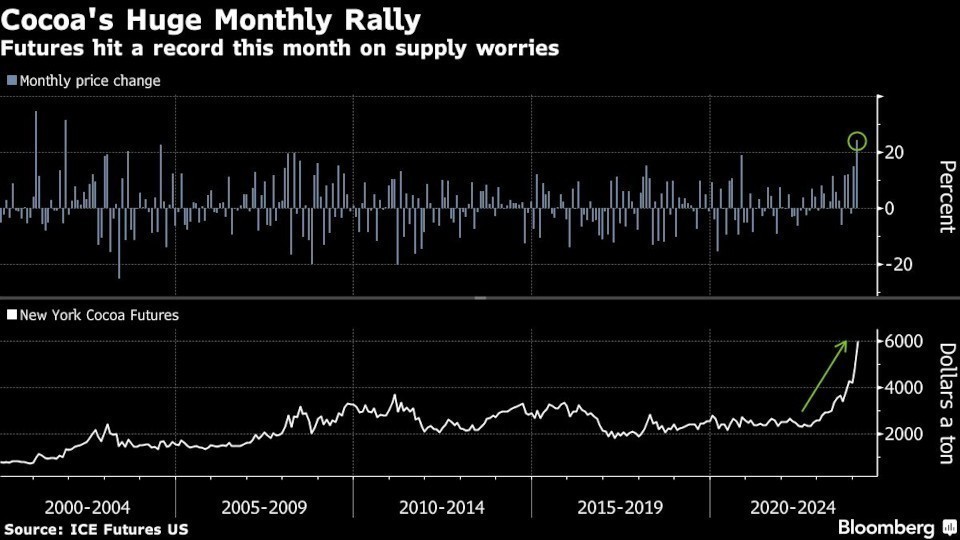 Τα προθεσμιακά συμβόλαια κέρδισαν 25% τον Φεβρουάριο, σημειώνοντας τη μεγαλύτερη μηνιαία άνοδο από το 2001, καθώς οι κακές καιρικές συνθήκες και οι ασθένειες έπληξαν τις καλλιέργειες στη Δυτική Αφρική, όπου υπάρχουν οι περισσότερες καλλιέργειες. Οι τιμές έφτασαν επίσης σε νέα ρεκόρ αυτόν τον μήνα, σημειώνοντας ενδοσυνεδριακό υψηλό 6.648 δολάρια ανά μετρικό τόνο τη Δευτέρα.