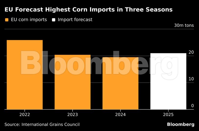 Η ΕΕ αναμένεται να εισαγάγει 21 εκατ. τόνους καλαμποκιού για τη σεζόν 2025-2026, σύμφωνα με πρόβλεψη του Διεθνούς Συμβουλίου Σιτηρών (IGC). Αυτό θα κατατάξει το μπλοκ ως δεύτερο μεγαλύτερο αγοραστή στον κόσμο για δεύτερη συνεχόμενη χρονιά, καθώς η Κίνα — παραδοσιακά μεγάλος εισαγωγέας ζωοτροφών — βρίσκεται αντιμέτωπη με χαμηλότερη ζήτηση.