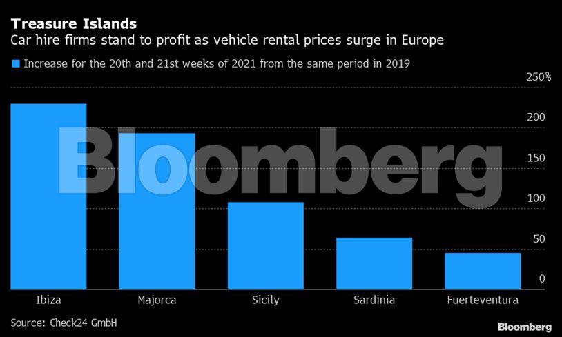 Οι ενοικιάσεις αυτοκινήτων στην Ισπανία αυξήθηκαν κατά 143% σε σχέση με το 2019, με 84% στην Ιταλία στο τέλος του Μαΐου. Οι τιμές στη Σικελία, τη Μαγιόρκα και την Ιμπιζα τριπλασιάστηκαν σύμφωνα με την ιστοσελίδα Check24.