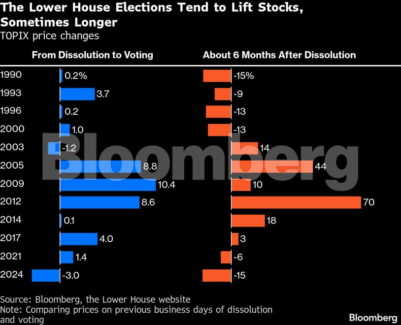 Ο δείκτης αναφοράς Topix έχει καταγράψει άνοδο στις 10 από τις 12 εκλογές για τη Βουλή που διεξήχθησαν από το 1990, στο διάστημα περίπου ενός μήνα μεταξύ της διάλυσης του κοινοβουλίου και της κάλπης, σύμφωνα με στοιχεία που συγκέντρωσε το Bloomberg.