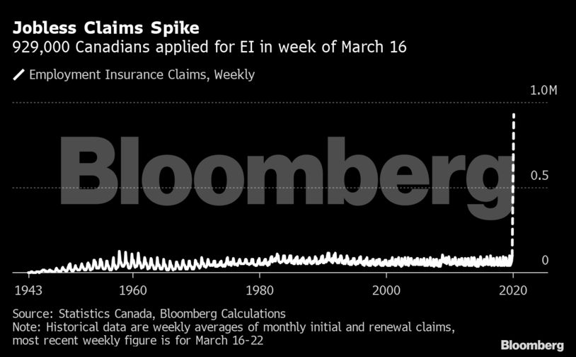 Τα τελευταία στοιχεία των ισχυρισμών υπογραμμίζουν την ταχύτητα με την οποία επιδεινώνεται η οικονομία της χώρας, καθώς οι Καναδοί παραμένουν στο σπίτι και οι κυβερνήσεις παροτρύνουν τις επιχειρήσεις να κλείσουν, εν μέσω προσπαθειών για τον έλεγχο της εξάπλωσης του κοροναϊού. Οι οικονομολόγοι έχουν μειώσει τις προβλέψεις για την ανάπτυξη και τώρα αναμένουν ότι το δεύτερο τρίμηνο του κύκλου εργασιών θα υποχωρήσει κατά περισσότερο από μισό αιώνα.