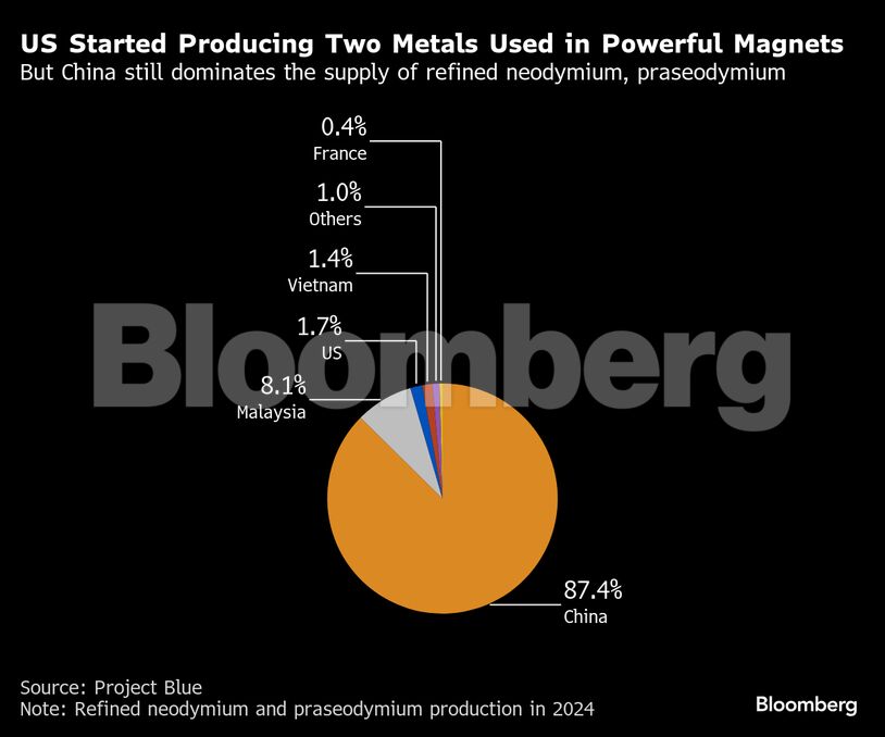 Αυτά τα δύο μέταλλα, παρότι κρίσιμα για την παραγωγή μόνιμων μαγνητών, δεν περιλαμβάνονται στους νέους περιορισμούς. Χρησιμοποιούνται σε ηλεκτροκινητήρες οχημάτων και ανεμογεννήτριες. Η MP Materials επαναλειτούργησε το ορυχείο Mountain Pass στην Καλιφόρνια το 2018 και το 2024 παρήγαγε 1.130 τόνους εξευγενισμένου neodymium-praseodymium, αν και η Κίνα διατηρεί την ηγεμονία στην επεξεργασία.