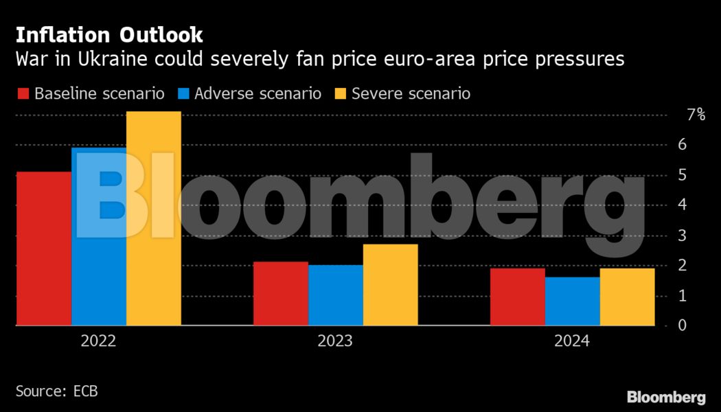 Οι επικαιροποιημένες προβλέψεις της ΕΚΤ που δημοσιεύθηκαν την περασμένη εβδομάδα έδειξαν βραδύτερη οικονομική επέκταση και ταχύτερη άνοδο του πληθωρισμό το 2022, με τον τελευταίο να υποχωρεί λίγο κάτω από τον στόχο του 2% το 2024. Ωστόσο, οι προοπτικές παραμένουν αβέβαιες καθώς οι αρνητικές επιπτώσεις της επίθεσης της Ρωσίας δεν έχουν αποκρυσταλλωθεί πλήρως.