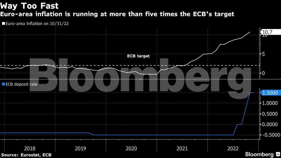 Δέκα από τα 25 μέλη του Διοικητικού Συμβουλίου της Τράπεζας θα μιλήσουν σήμερα, λίγες μόλις ημέρες μετά την ανακοίνωση των στοιχείων της Eurostat που έδειξαν ότι οι τιμές καταναλωτή αυξήθηκαν κατά 10,7% τον Οκτώβριο, πάνω από το αναμενόμενο και πέντε φορές περισσότερο από τον επίσημο στόχο. Στο επίκεντρο βρίσκεται τώρα οι δράσεις που αναμένεται να ληφθούν τον επόμενο μήνα, με τα «γεράκια» και τα «περιστέρια» να συμφωνούν ότι χρειάζονται περαιτέρω αυξήσεις. Δεν είναι μόνο τα επιτόκια, τα οποία διπλασιάστηκαν στο 1,5% τον περασμένο μήνα στον πιο επιθετικό κύκλο νομισματικής σύσφιξης στην ιστορία της ΕΚΤ, αλλά εξακολουθούν να υστερούν σε σχέση με αυτά των ΗΠΑ. Οι αξιωματούχοι συζητούν επίσης πώς να μαζέψουν τα περίπου 5 τρισεκατομμύρια ευρώ (4,9 τρισεκατομμύρια δολάρια) από τα ομόλογα που αγοράστηκαν κατά τη διάρκεια πρόσφατων κρίσεων.