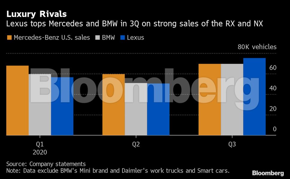 Η Lexus ξεπέρασε την πανδημία καλύτερα από τις 2 γερμανικές εταιρείες, με το μοντέλο RX να έχει ισχυρή ζήτηση το τρίμηνο. Τόσο η Mercedes όσο και η BMW είχαν έλλειψη αποθεμάτων, καθώς τα εργοστάσια τέθηκαν σε αδράνεια στην Ευρώπη και τις ΗΠΑ για εβδομάδες. Μόνο τον Σεπτέμβριο οι πωλήσεις της ιαπωνικής εταιρείες εκτινάχθηκαν κατά 31%.