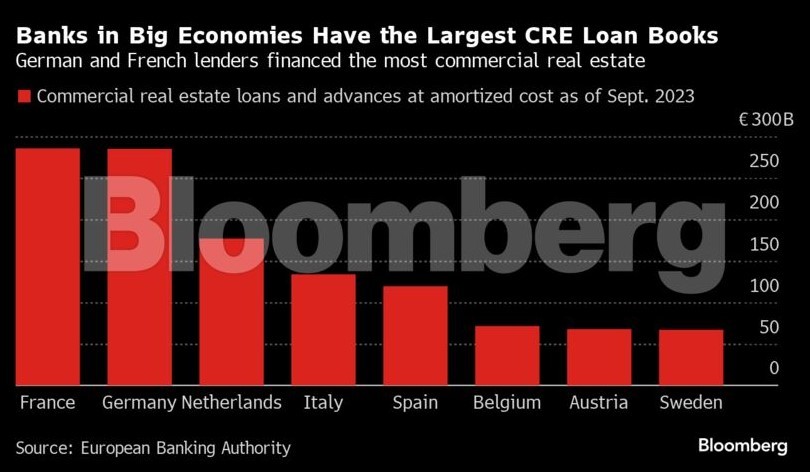Στοιχεία της European Banking Authority έδειξαν επίσης πως οι γερμανικές και οι γαλλικές τράπεζες έχουν τη μεγαλύτερη έκθεση μεταξύ των χρηματοπιστωτικών ιδρυμάτων στην ΕΕ σε δάνεια για εμπορικά ακίνητα, δημιουργώντας έναν αυξημένο κίνδυνο για τη σταθερότητα του συστήματος.