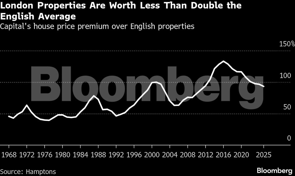 Η υπεραξία των τιμών των ακινήτων στο Λονδίνο σε σχέση με τις αγγλικές κατοικίες στο σύνολό τους έχει συρρικνωθεί στο χαμηλότερο επίπεδο των τελευταίων 14 ετών, σύμφωνα με στοιχεία της Hamptons. Πλέον, οι αξίες κατοικιών στην πρωτεύουσα είναι μικρότερες από το διπλάσιο του εθνικού μέσου όρου. Στο μέγιστο χάσμα του 2016, τα ακίνητα στο Λονδίνο αποτιμούνταν κατά 133% υψηλότερα σε σύγκριση με τα αντίστοιχα στην υπόλοιπη Αγγλία.