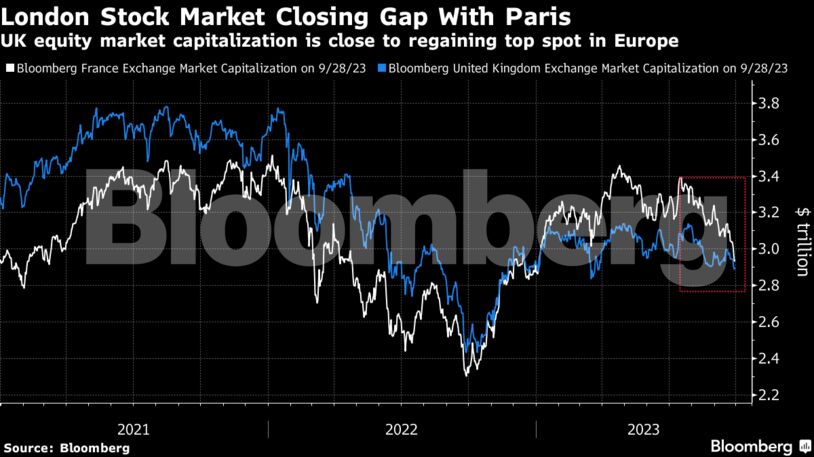 Η συνδυασμένη κεφαλαιοποίηση σε δολάρια των πρωτογενών βρετανικών εισηγμένων ανέρχεται πλέον σε 2,90 τρισ. δολάρια έναντι 2,93 τρισ. δολαρίων της Γαλλίας, σύμφωνα με δείκτη που καταρτίζει το Bloomberg. Το χάσμα μεταξύ των δύο μειώνεται σταθερά, κυρίως λόγω της διολίσθησης της αξίας της Γαλλίας από το περσινό ρεκόρ των 3,5 τρισ. δολαρίων, καθώς η οικονομική κατήφεια στη βασική κινεζική αγορά βαθαίνει.
