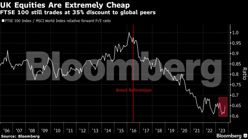 Η πολυετής πτώση έχει καταστήσει τις εισηγμένες στο Λονδίνο μετοχές εξαιρετικά φθηνές σε σχέση με τις αντίστοιχες μετοχές. Με βάση τον μελλοντικό δείκτη τιμής προς κέρδη, ο FTSE 100 διαπραγματεύεται σήμερα με έκπτωση 35% σε σχέση με τον παγκόσμιο δείκτη MSCI World Index.
