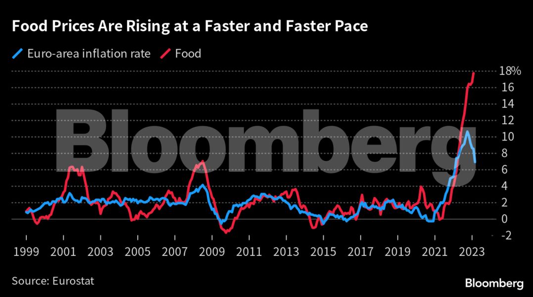 Σε ορισμένες χώρες της ευρωζώνης, οι τιμές των τροφίμων αυξάνονται με ρυθμό που δεν έχει παρατηρηθεί στη μεταπολεμική ιστορία, σύμφωνα με την ανώτερη οικονομολόγο του ομίλου Rabobank Maartje Wijffelaars. Τα στοιχεία της περασμένης εβδομάδας έδειξαν ότι ο πληθωρισμός στην ευρωζώνη υποχώρησε στο 6,9% τον Μάρτιο.