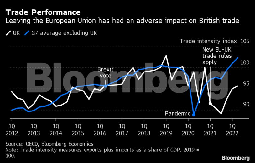Σύμφωνα με το Γραφείο Προϋπολογισμού της Βρετανίας, το Brexit θα περιορίσει το βρετανικό ΑΕΠ κατά 4% σε μακροπρόθεσμο επίπεδο, ενώ ο εμπορικός ισολογισμός της χώρας υστερεί πολύ σε σχέση με τις ανταγωνιστές της και ανακάμπτει με πολύ βραδύτερο ρυθμό.