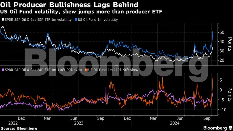 Η ανοδική διάθεση για τον «μαύρο χρυσό» -τόσο για το Brent όσο και για το WTI- ξεπέρασε εκείνη για τους παραγωγούς, οι οποίοι είναι πιθανό να καταγράψουν κέρδη μόνο αν οι τιμές παραμείνουν υψηλότερες για μεγαλύτερο χρονικό διάστημα. Η μεταβλητότητα και η κλίση των δικαιωμάτων αγοράς σε δικαιώματα προαίρεσης για το ETF US Oil Fund LP αυξήθηκαν αμφότερα περισσότερο από ό,τι για το SPDR S&P Oil & Gas Exploration & Production ETF, σύμφωνα με το Bloomberg.