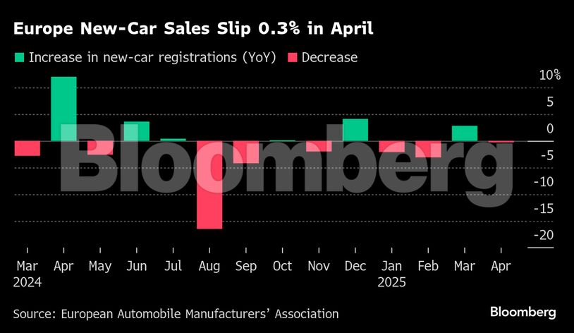 Οι πωλήσεις νέων αυτοκινήτων στην Ευρώπη υποχώρησαν τον Απρίλιο, καθώς η ασθενής οικονομική ανάπτυξη και η αβεβαιότητα από τις παγκόσμιες εμπορικές εντάσεις οδήγησαν τους καταναλωτές σε αναβολή μεγάλων αγορών.
