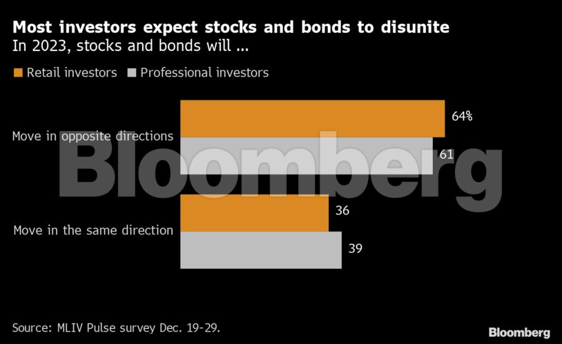Μετά από τις σημαντικές απώλειες των «ορθόδοξων» χαρτοφυλακίων 60/40 (μετοχές/ομόλογα) το 2022, τα πράγματα ενδέχεται να βελτιωθούν φέτος. Πολλοί αναλυτές αναμένουν πως ο πληθωρισμός έχει επιτύχει το ζενίθ του, ενώ το 60% των 610 ερωτηθέντων πρόσφατης δημοσκόπησης της MLIV Pulse, υπολογίζουν πως τόσο οι μετοχές όσο και τα ομόλογα θα ακολουθήσουν αντίθετη μεταξύ τους πορεία φέτος, επιστρέφοντας στο κλασικό «αφήγημα» των αγορών.