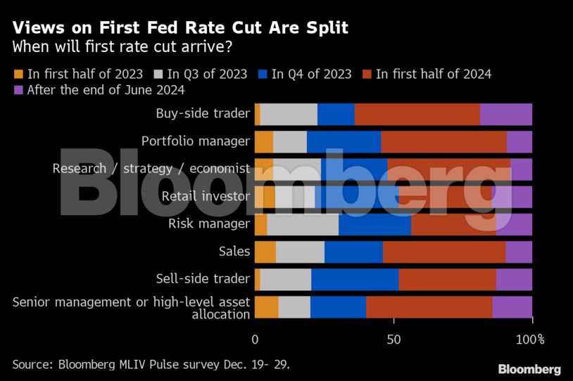 Το 42% των ερωτηθέντων της έρευνας συμφωνούν με τις εκτιμήσεις των ρυθμιστικών αρχών πως τα επιτόκια θα αγγίξουν το 5%-5,25%. Περίπου το 52% των ερωτηθέντων εκτιμούν πως το «πίβοτ» της Fed θα συμβεί μέσα στο 2023, ενώ το 54% μία τέτοια κίνηση το αναμένουν το 2024.